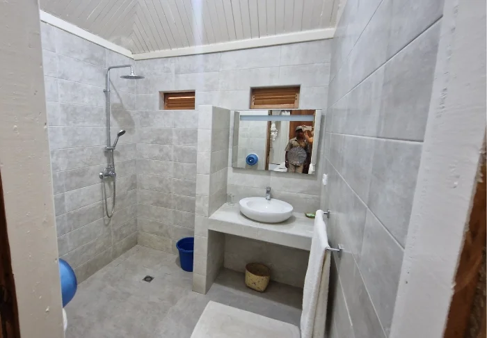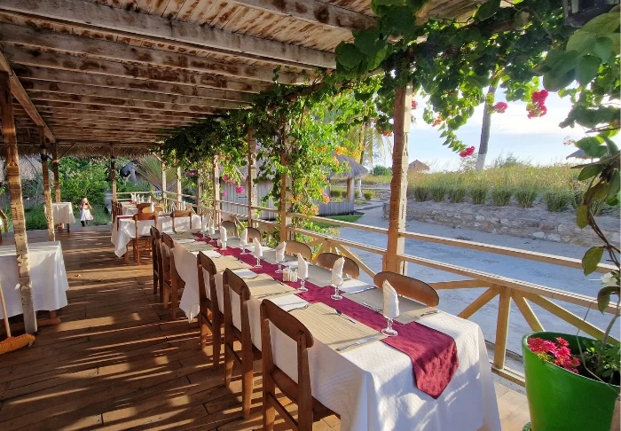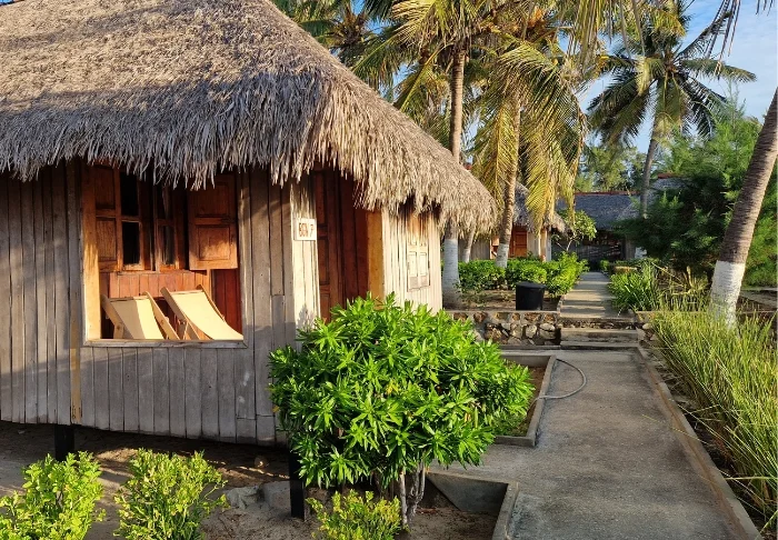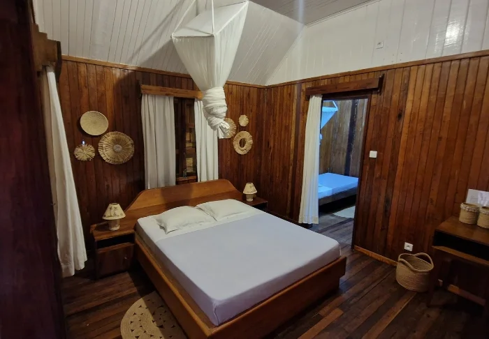 Bungalowerna är otroligt charmigt inredda i klassisk malagassisk stil: relativt enkelt, men snyggt och prydligt, och nästan allt är gjort av det vackraste, gyllene trä. Alla bungalower har en egen terrass med två liggstolar, och det är lockande att tillbringa en hel dag med att bara sitta här, slappna av och läsa en bok. Trädgården runt bungalowerna är full av de vackraste, färgglada blommorna.