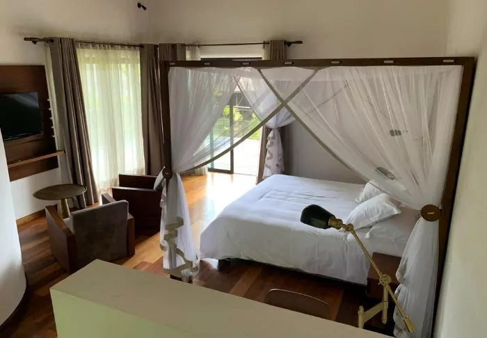 Bungalowerna är något i särklass! I varje bungalow finns ett badrum med ett fristående badkar, en privat balkong med utsikt över en sjö, te- och kaffefaciliteter, sänglinne i finaste bomull, en minibar och Wi-Fi (som på bästa Madagaskar-sätt kan vara lite instabil). Bungalowerna ligger på två nivåer och har plats för både en säng och en liten relaxavdelning, och är inredda i dämpade neutrala färger.