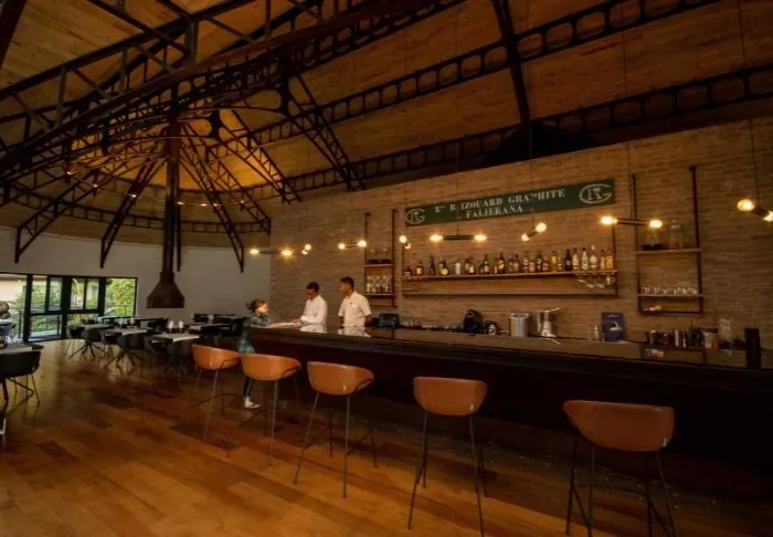 Lodgen kännetecknas av sin supermoderna och samtidigt både råa och eleganta industriella design med högt i tak, en stor öppen spis mitt i restaurangen och tak med stålstrukturer. Inspiration har tydligt hämtats från grafitgruvan och den tillhörande industrin som du för vidare på vägen till lodgen.