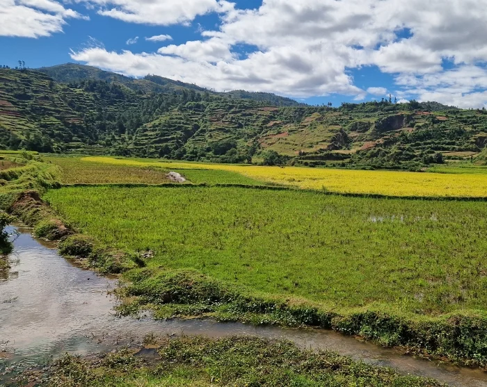 Vägen går genom det centrala höglandet, fyllt av risfält och vackra terrasserade odlingar. Titta ner i dalarna – varje liten jordplätt har omvandlats till ett risfält, och noggrant grävda bevattningskanaler ger odlingarna det livsviktiga vattnet. Det sägs ibland att madagaskerna tillhör de folk i världen som äter mest ris dagligen, och du kommer snabbt att märka att ris är en hel vetenskap här – det är långt ifrån bara ris!