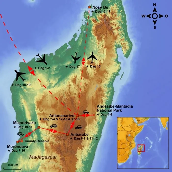 Resan börjar i Madagaskars spännande huvudstad, Antananarivo. Här får du möta kungar och drottningar och höra mer om landets historia, innan du reser vidare till Andasibe-Mantadia nationalpark.