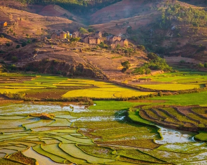 Idag färdas du huvudsakligen genom det centrala höglandet. Här breder risfält och praktfulla risodlingar ut sig på terrasser. Titta ner i dalgångarna – även den minsta yta odlas med ris, och välgrävda bevattningskanaler förser markerna med det nödvändiga vattnet. Malagassier sägs ibland vara bland världens största risätare, och du kommer snart att märka att ris är mer än bara ris – det är en hel vetenskap.