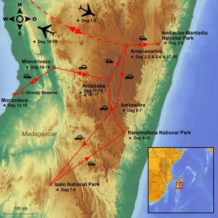 Idag är det avresa från vald flygplats med mellanlandning(ar) på vägen. Resan går till fantastiska Madagaskar, den stora röda ön i Indiska oceanen.