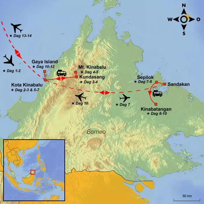 Möt naturens underverk i Borneos nordligaste stat, Sabah, där storslagna upplevelser tävlar om uppmärksamheten. Under resan kommer du att bestiga Sydostasiens högsta berg, Mt. Kinabalu, och uppleva regnskogens magiska scen och fascinerande djurliv. Avsluta med att njuta av paradisön Gaya Island med snorkling i världsklass.