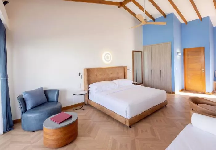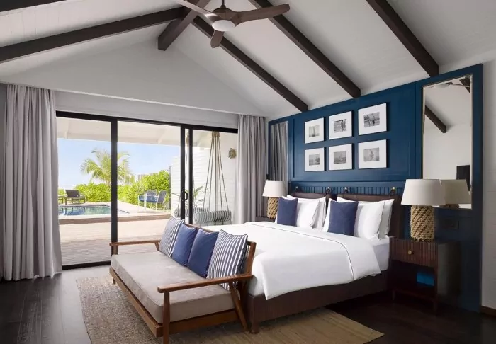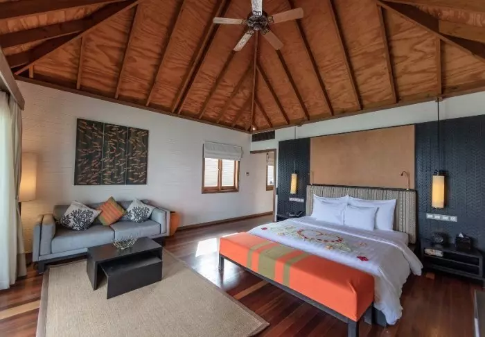 De 54 kvadratmeter stora strandvillorna har plats för antingen två vuxna och två barn eller tre vuxna. Villorna är ljusa och rymliga och inredda med traditionella trämöbler och färgrika tyger. Varje villa är utrustad med aircondition, takfläkt, wifi, minibar, tv, telefon, kaffe- och tefaciliteter samt sminkhörna/skrivbord. Det finns badrum både inom- och utomhus, med badkar inne och ”open air”-dusch ute. Villorna har egen veranda med stolar och solstolar samt direkt åtkomst till den kritvita sandstranden.