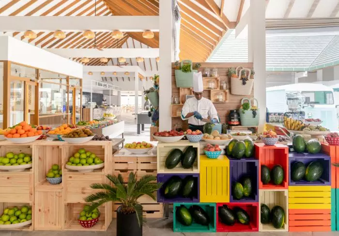 Det finns tre matställen på ön: huvudrestaurangen The Market är designad likt en utomhusmarknad och erbjuder ett brett urval av rätter från hela världen. Varje dag är det olika teman, som får det att vattnas i munnen. Dessutom finns den italienska pizzerian Il Basilico, som lagar olika italienska rätter, och Chiringuito, som är både restaurang och bar och bjuder på bland annat grillmat. Huvudbaren Rainbow är samlingsplatsen som serverar färgglada drinkar och bjuder på livemusik och underhållning varje kväll.