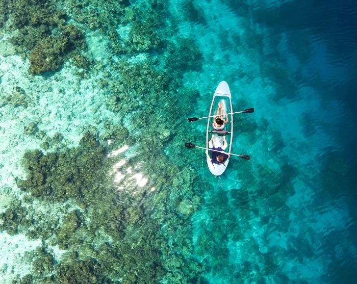 Under denna tidiga morgonutflykt får du glida fram över det klara vattnet i en genomskinlig kajak, medan solen sakta stiger upp över horisonten och målar himlen i gyllene nyanser.