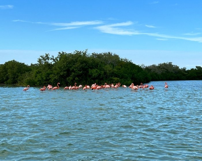 Du kommer att hämtas på ditt hotell på morgonen, varefter det första stoppet blir den lilla fiskebyn Rio Lagartos, cirka 100 km norr om Valladolid. Här börjar du ditt naturäventyr med en 2-timmars båttur i biosfärreservatet med nästan samma namn: Ría Lagartos. Här kan du se fram emot att se en mängd exotiska fåglar, inklusive den vackra rosa flamingon, när du ger dig in i mangrovekanalerna för att utforska den omfattande naturliga mångfalden. Flamingor kan ses under hela året, men de är extra många under perioden april till augusti, när de samlas här för att para sig. Kanske har du också turen att upptäcka en krokodil som ligger och väntar i vattenbrynet.