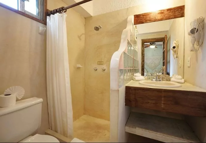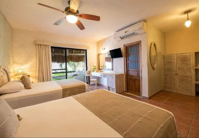 Hotellets 33 rum är ljust inredda i rustik mexikansk stil med trämöbler och dekorativa detaljer, som ger det en avslappnad och hemtrevlig känsla.