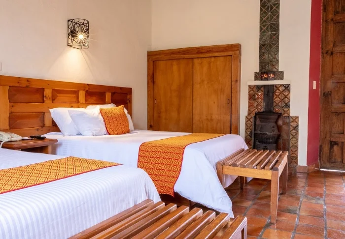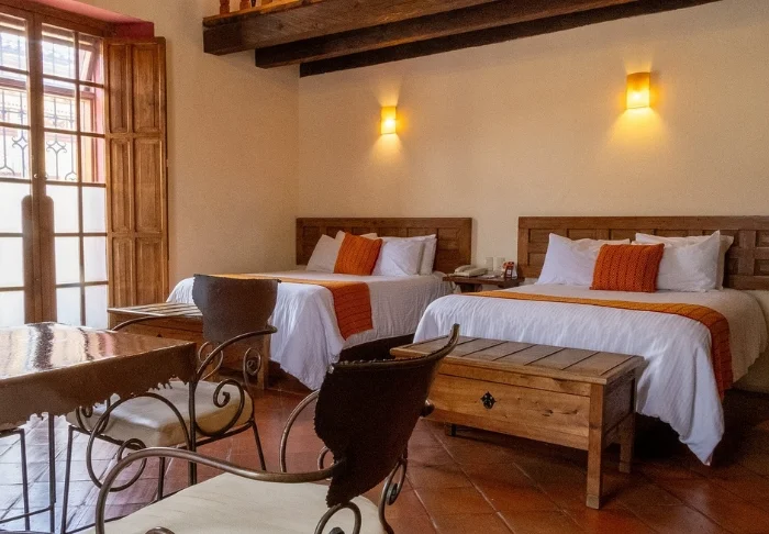 Det finns totalt 78 rum, och alla är inredda med varma färger och klassiska mexikanska trämöbler, vilket ger en mysig och autentisk upplevelse. Rummen har även kassaskåp, kabel-TV, wifi och eget badrum med hårtork.