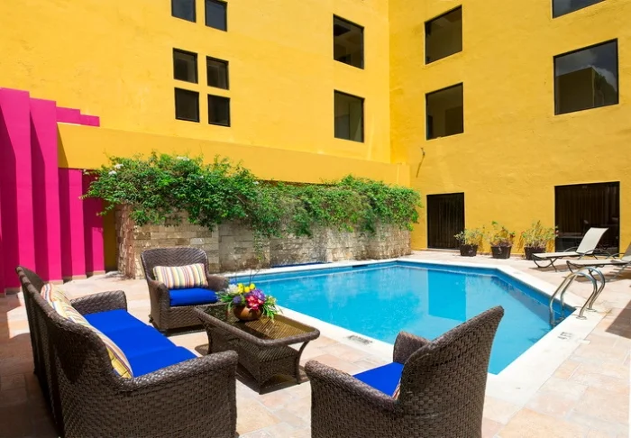 Ta ett uppfriskande dopp i den lilla poolen, eller vila i en solstol medan du tänker tillbaka på dagens upplevelser. Frukosten serveras i hotellets restaurang, och precis utanför hittar du ett brett utbud av caféer och restauranger där du kan prova spännande mexikanska specialiteter.
