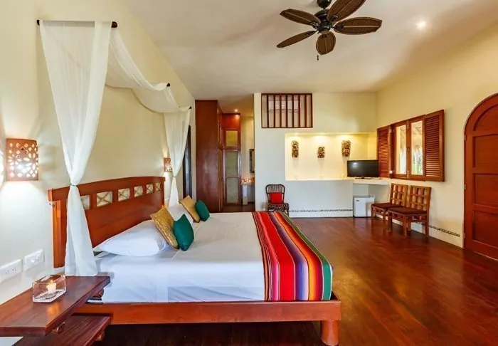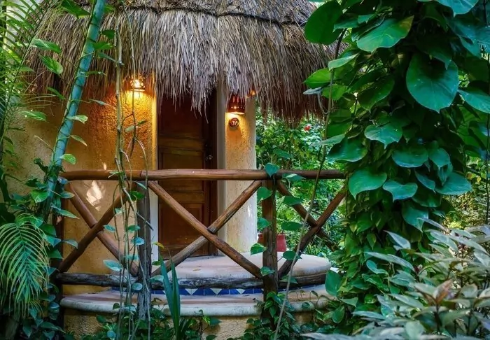 Du bor i charmiga stugor byggda i naturmaterial, med tak av torkade palmblad. Rummen är rymliga och elegant inredda med en harmonisk blandning av ljusa färger, färgglada mexikanska mattor och kuddar samt vackra mörka trägolv och möbler.