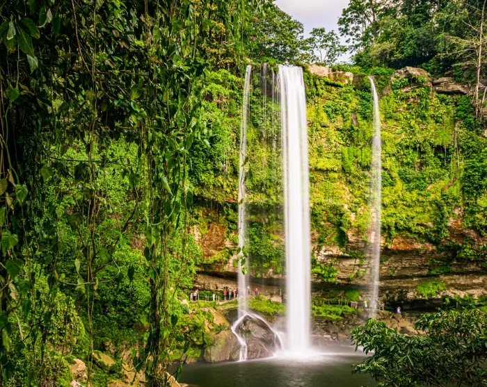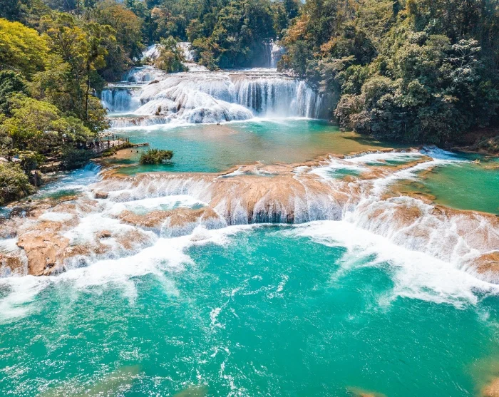 Första stoppet är de berömda Agua Azul-vattenfallen – en serie brusande fall där turkosblått vatten forsar nedför vita kalkstensavsatser i flera nivåer. Den karakteristiska vattenfärgen beror på det höga innehållet av mineraler och kalk som reflekterar solljuset och skapar en nästan sagolik miljö. Vattenfallen ligger i frodig regnskog och längs floden bildas små naturliga bassänger där du kan ta ett svalkande dopp.