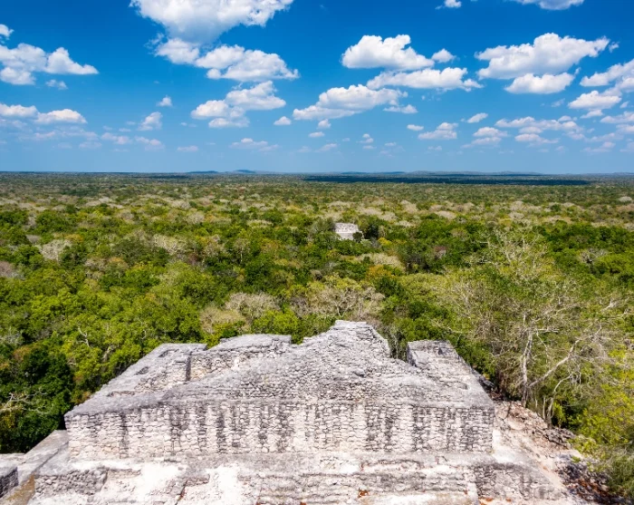 Efter några timmars bilresa genom små byar och tät växtlighet kommer du in i Biosfera de Calakmul, ett stort naturreservat där apor, tukaner och till och med jaguarer lever. Här döljer sig den uråldriga mayastaden Calakmul, omgiven av frodig vegetation.