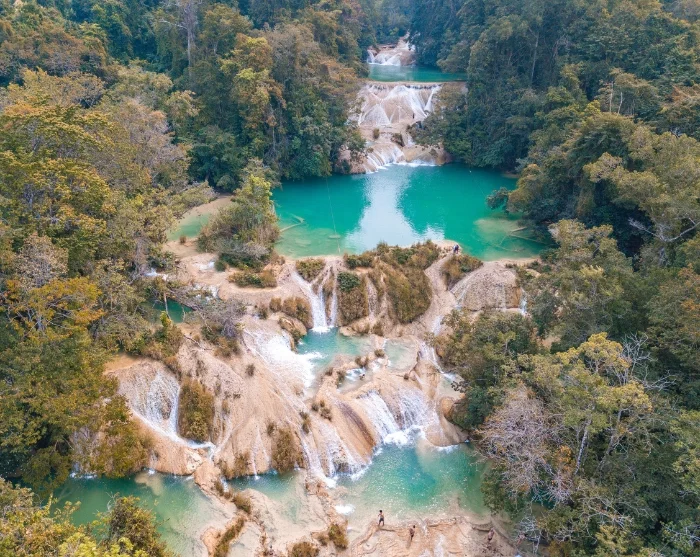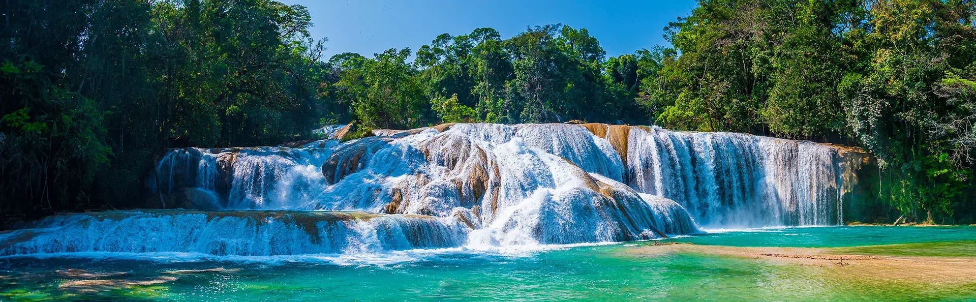 Första stoppet är vid Agua Azul-fallen (de blå vattenfallen), en serie forsande vattenfall där turkosblått vatten rinner över vita kalkstensavsatser i flera nivåer. Vattnets karakteristiska färg beror på det höga innehållet av mineraler och kalk, vilket reflekterar solljuset och skapar en nästan sagolik kuliss. Vattenfallen ligger mitt i frodig regnskog, och längs floden bildas små naturliga bassänger där du kan ta ett uppfriskande dopp. Nästa stopp är Misol-Ha-vattenfallet, ett enstaka vattenfall på cirka 35 meter, som faller dramatiskt ner i en smaragdgrön lagun mitt i regnskogen. En liten stig leder bakom vattenfallet, där du kan stå i skydd av den brusande kaskaden och uppleva naturens krafter på nära håll.
