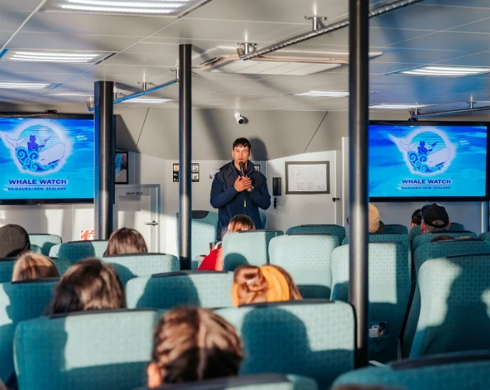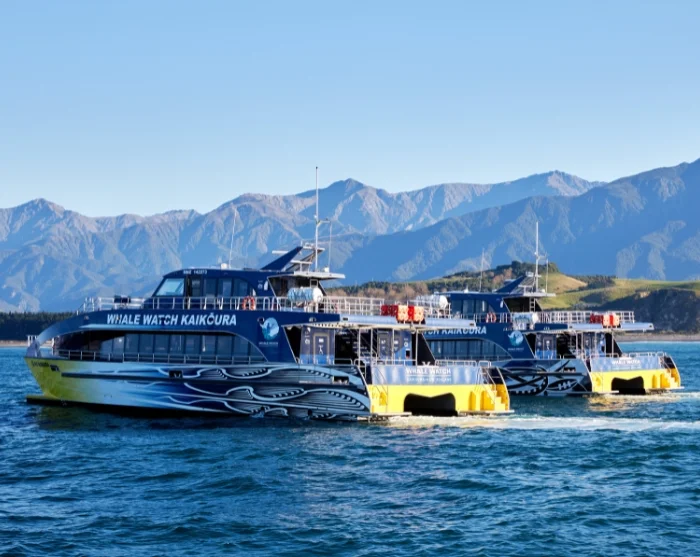 När du har parkerat din bil och checkat in på Whale Watch Kaikoura (minst 30 minuter före avgång) körs du i buss ner till South Bay Marina (cirka 10 minuter), där du går ombord på en modern katamaran som är särskilt framtagen för valsafari. Här står kaptenen och besättningen redo att ge dig de bästa möjligheterna för att se valar samt andra havsdjur och havsfåglar.