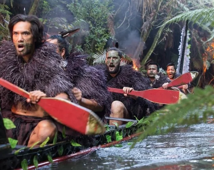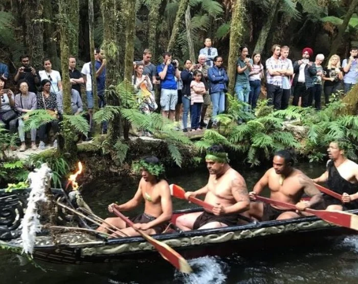 Du får bland annat se krigare paddla nerför Wai-o-Whiro-floden i en traditionell krigskanot (waka).