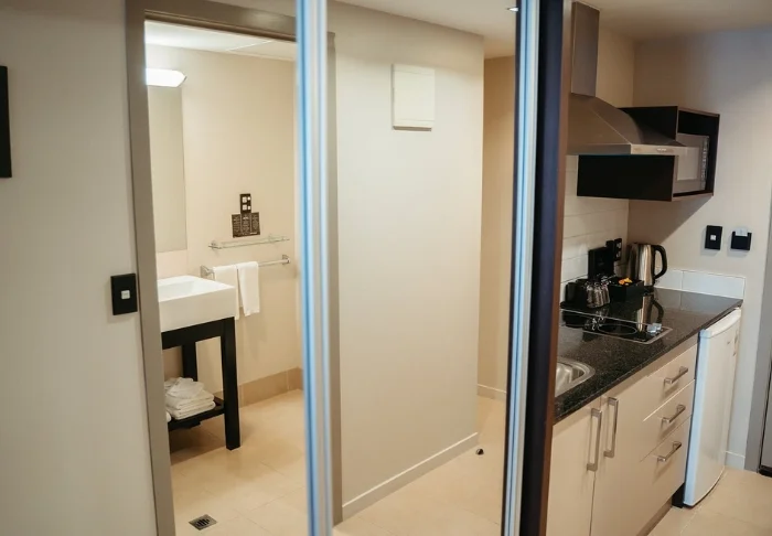 De 25 rymliga rummen är ljust inredda och har eget badrum samt ett välutrustat pentry med mikrovågsugn, kylskåp och kokplattor, så att du enkelt kan laga egna måltider.