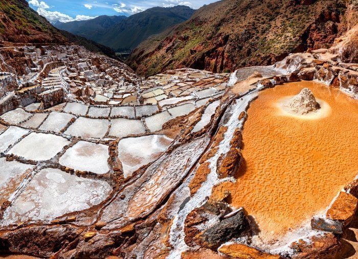 Detta unika landskap består av över 3 000 små bassänger, som är uthuggna i en bergssida och dagligen fylls med saltvatten från en närliggande källa. När vattnet förångas efterlämnas ett lager av rent salt, som först samlas upp och därefter säljs av lokalbefolkningen. Saltbassängerna har används i århundraden och härstammar ända från före inkatiden. Förutom att vara en viktig intäktskälla för lokalbefolkningen är det också en imponerande syn att uppleva.