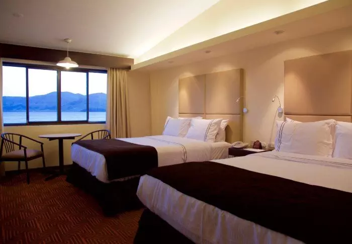 Hotellet har 62 rum som alla är utrustade med tv, aircondition, telefon, wifi, värdeskåp och badrum med hårtork. Lake View-rummen erbjuder en härlig panoramautsikt över sjön, som omges av berg. Magiskt!