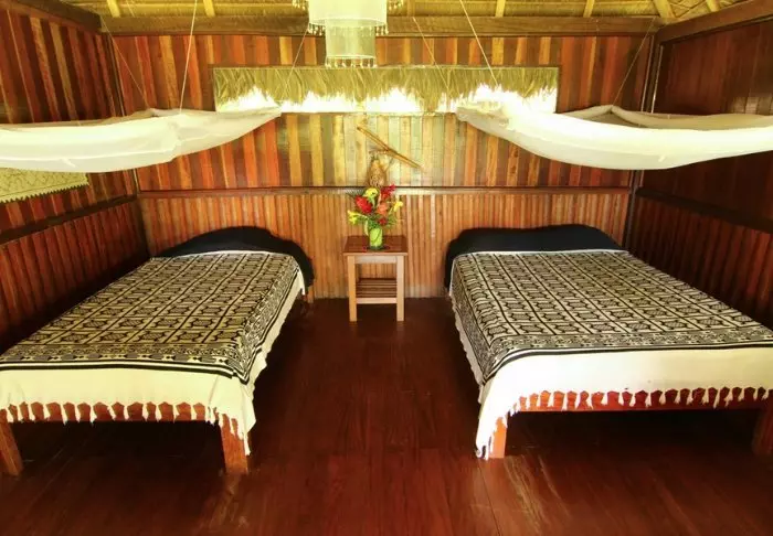 Här finns 25 vackert inredda bungalower – alla byggda i trä och på pålar så att de inte blir översvämmade när det kommer kraftiga tropiska regnoväder. Bungalowerna har sköna sängar med myggnät, takfläkt och privat badrum med varmt vatten, morgonrock och toalettartiklar.