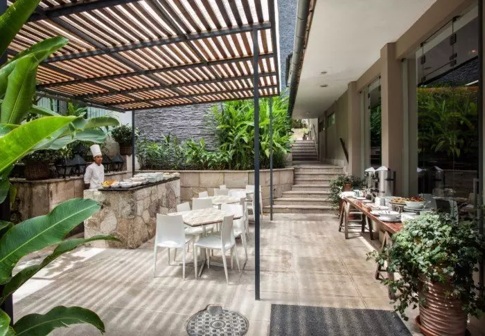I denna vackert bevarade koloniala byggnad hittar du sju dekorativa innergårdar, var och en avsedd för olika ändamål. Till exempel finns det en med en uteservering, som tillhör restaurangen, en annan för träning/yoga om man vill vara aktiv under semestern och en tredje som fungerar som en lounge för avkoppling och umgänge.