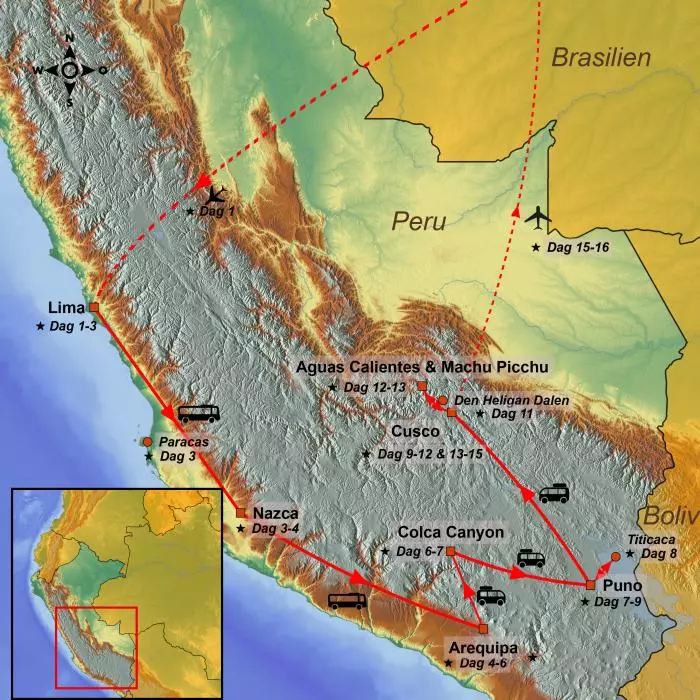 Peru är ett fantastiskt spännande resmål. Du börjar i huvudstaden Lima och fortsätter till det lilla Galápagos, Islas Ballestas, där du kan betrakta bågformade klippor, blåfotade sulor, pingviner och sjölejon. Det är även härifrån du kan se La Candelabra vid Paracas-halvön. Ett av resans höjdpunkter är Nazcalinjerna, som endast kan ses från luften. Du besöker den ”Vita Staden” Arequipa och den djupa ravinen Colca Canyon. Vid världens största sjö, Titicacasjön, möter du lokalbefolkningen och lär dig om deras kultur och vardagsliv. Resan går vidare till Inkarikets gamla eleganta huvudstad Cusco och den Heliga Dalen med besök i museumstäta Ollantaytambo samt Pisac, känt för sina marknader och imponerande ruiner. En annan höjdpunkt är det världsberömda ruinkomplexet Machu Picchu, där du kan njuta av den magiska utsikten över höga berg och dimskog innan turen slutar i Cusco, där hemresan börjar.