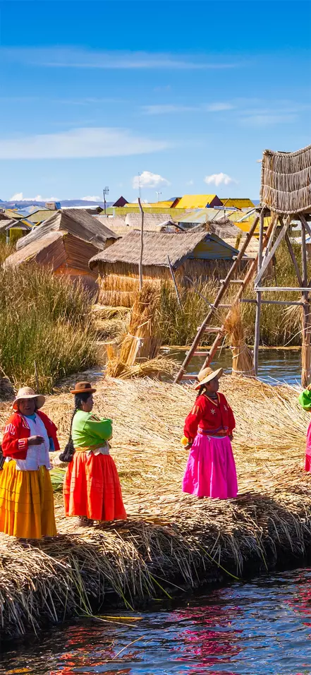 Från stadens hamn seglar du först ut till de flytande vassöarna, Islas Uros, som fortfarande bebos av urosfolket. Detta folk använder sjöns starka totoravass för att bland annat bygga öar, hus och båtar. Även om öarna i dag har kommersialiserats något så är det fortfarande fascinerande att lära sig mer om urosfolkets kultur och gamla traditioner och inte minst att uppleva deras imponerande hantverk.
