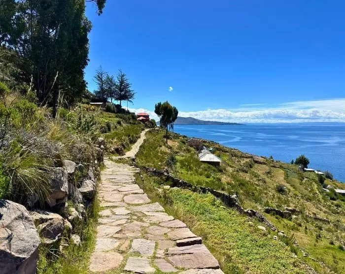 Du äter lunch på den vackert kuperade ön och därefter tar din guide med dig på en promenad upp till öns högsta punkt, där du kan njuta av en imponerande utsikt över Titicacasjön med höga berg i bakgrunden.