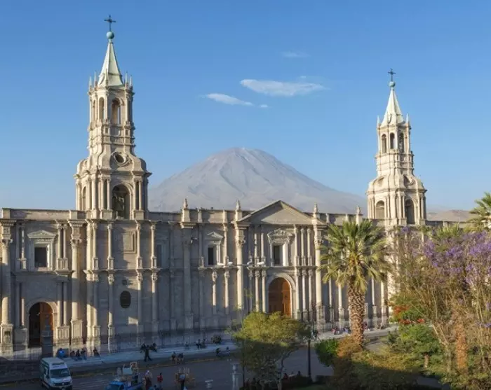 Arequipa har ett vackert läge i Anderna på nästan 2 400 meters höjd med vulkanerna Misti (5 822 meter), Chachani (6 057 meter) och Pichu-Pichu (5 669 meter) som vacker kuliss. Staden kallas även ”Den vita staden” eftersom de flesta av husen är byggda av vulkanisk sten.