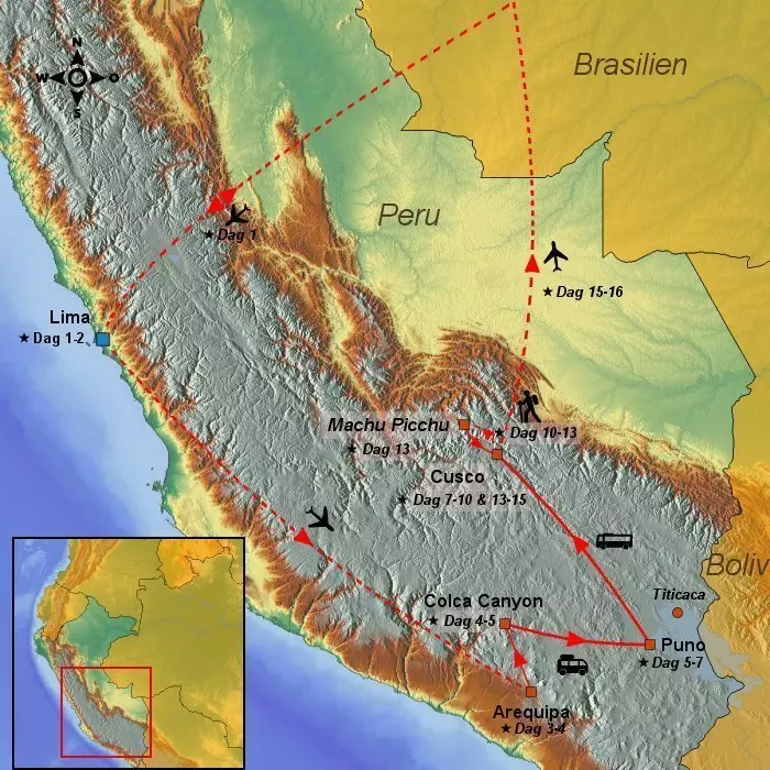 Peru är inkaimperiets skattkammare och bjuder på några av Sydamerikas mest fantastiska kultur- och naturupplevelser. Här väntar koloniala pärlor, dramatiska berg och vulkaner, Colca Canyon och den Heliga Dalens imponerande terrassodlingar, spännande lokala samhällen och färgrika marknader. Du får även chansen att upptäcka landets unika djurliv med lamadjur, alpackor och kondorer. Vid Titicacasjön kommer du nära Urosfolket och besöker inkakulturens gamla huvudstad Cusco, där du bland annat ser deras mästerliga stenhuggerikonst. Därefter börjar ditt inkatrek längs den berömda Inkastigen. Under vandringen får du utforska imponerande ruiner, fantastiska landskap med gröna dalar, snötäckta bergstoppar, ett överflöd av unika växter och ett rikt djurliv – samt ett av världens nya underverk, Machu Picchu, som en perfekt avslutning på ditt trekkingäventyr.