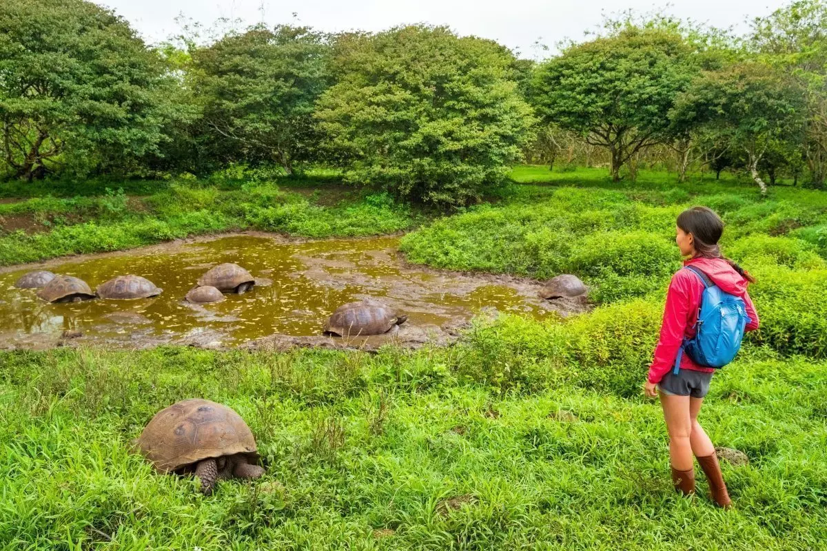 Första stoppet är vid Los Gemelos (”tvillingkratrarna”), vilket är två enorma slukhål som ligger bredvid varandra. Runt hålen kan du uppleva ett rikt fågelliv i den frodiga skogen av korgblommiga växter (Scalesia). Efter en kort promenad kring hålen går turen vidare till ranchen Hacienda Primicias, där din första stora djurupplevelse väntar. Här lever världens största sköldpadda, galápagossköldpaddan, i det fria. Det är en fantastiskt upplevelse att komma riktigt nära de enorma djuren, som kan väga upp till 250 kg och bli över 100 år gamla. Du njuter av din inkluderade lunch på ranchen i de exotiska omgivningarna.