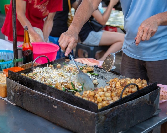 Utflykten fortsätter genom gatorna i Chinatown och passerar stånd som säljer exotiska frukter, inklusive den ökända frukten durian, som du kommer att kunna smaka. Du kommer också att passera en mängd olika matstånd, där du kan sätta tänderna i lokalbefolkningens favorit, stekt morotskaka eller nudelrätten char keow teow.