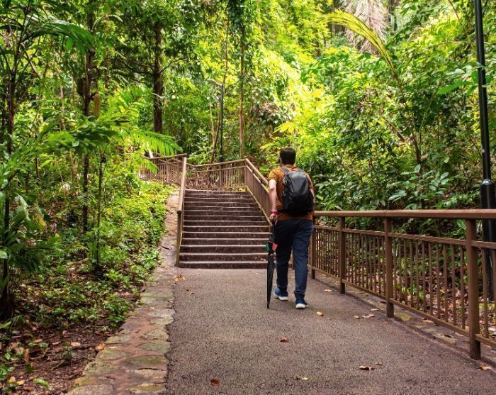 Du följer din guide upp till toppen av Mount Faber, som man når till fots genom en frodig skog. Stigen är 3,5 km lång och kan karaktäriseras som enkel. Längs stigen kommer du korsa flera moderna och imponerande gångvägar, inklusive Henderson Waves, Southern Ridge och Alexandra Arch, som framstår som arkitektoniska pärlor i det annars orörda landskapet.