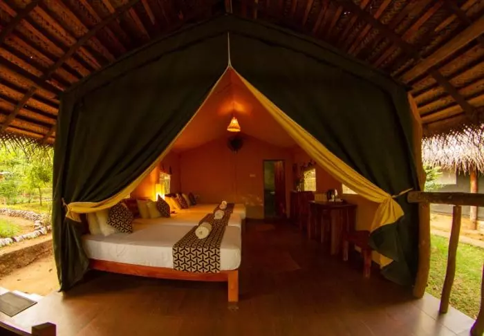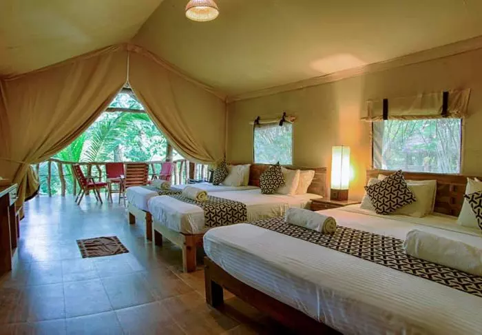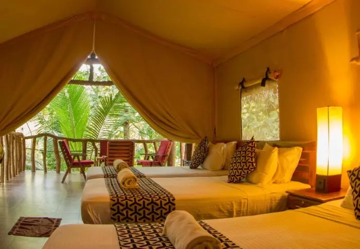 Det består av lyxiga tält, som präglas av äventyr och avslappning. De ligger mitt i den fantastiska naturen, så du kan se fram emot att vakna upp till både fågelkvitter och det rogivande porlandet av floden. Tälten är utrustade med riktiga sängar och eget badrum med både varmt och kallt vatten. Varje tält har dessutom gratis mineralvatten på flaska och en vattenkokare, så att du kan laga dig en kopp te eller kaffe att njuta av på verandan. Du kan låna myggnät och hårtork i receptionen och det finns gratis wifi i de gemensamma utrymmena.