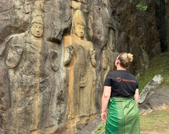 På vägen stannar du vid Buduruwagala-templet, som har sina rötter ända tillbaka till 900-talet och är känt för sina välbevarade klippreliefer. Templet ligger vid en stor klippvägg där en 16 meter hög Buddhastaty reser sig, omgiven av sex mindre figurer som visar Buddha i olika meditationspositioner. Du kan i lugn och ro beundra deras detaljrikedom och fridfulla uttryck, eftersom Buduruwagala har en mer stillsam atmosfär än många av Sri Lankas mer välkända tempel.