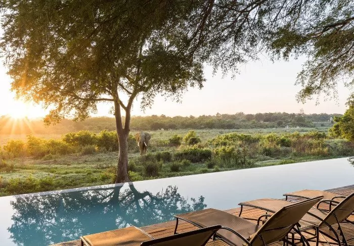 Från det mysiga loungeområdet vid den ena poolen har du utsikt över Kruger nationalpark på den andra sidan av floden Sabie. Tidigt på morgonen eller sent på eftermiddagen är ljuset helt fantastiskt, och har du tur kommer en flock elefanter ner för att bada i floden.