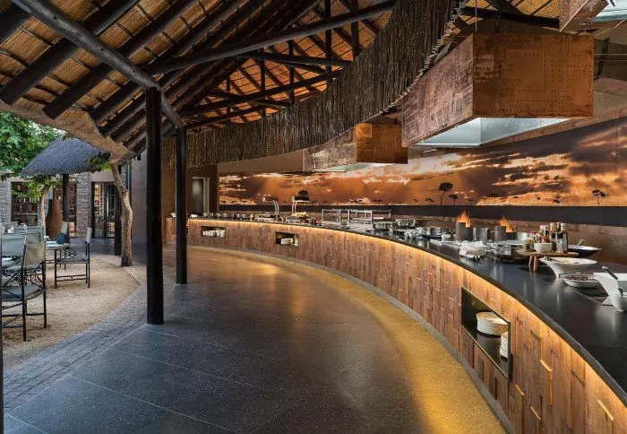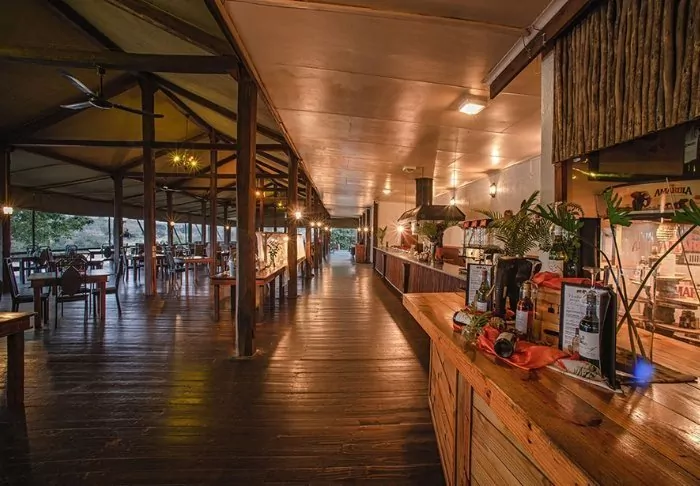 I lägret finns en härlig restaurang, en livlig bar, en utmärkt liten butik och flera ”boma”, vilket är de typiska sydafrikanska bålplatserna där maten serveras under bar himmel.