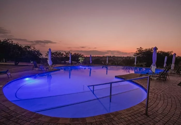 Lägret ligger på ett privat område inne i själva Kruger nationalpark och från poolen har du en vacker utsikt över nationalparken. En flock flodhästar brukar besöka floden nedanför den stora gräsmattan och det har satts upp bänkar (och staket!) så att du i lugn och ro kan sitta och lyssna på deras frustanden i vattnet nedanför.