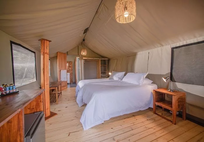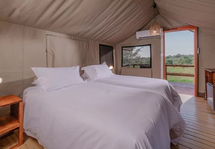Här bor du i rymliga, sköna kanvastält som står en bit ovanför marken på plattformar. Tälten har moderna bekvämligheter som trägolv, elektricitet och aircondition, bra toalett- och badutrymmen samt kaffe- och tefaciliteter. Tack vare kanvasväggarna kan du fortfarande höra och känna doften av naturen, som ligger rakt utanför dörren! Här finns både tält med dubbelsäng och tält som är lämpade för familjer. Alla tält har egen veranda.