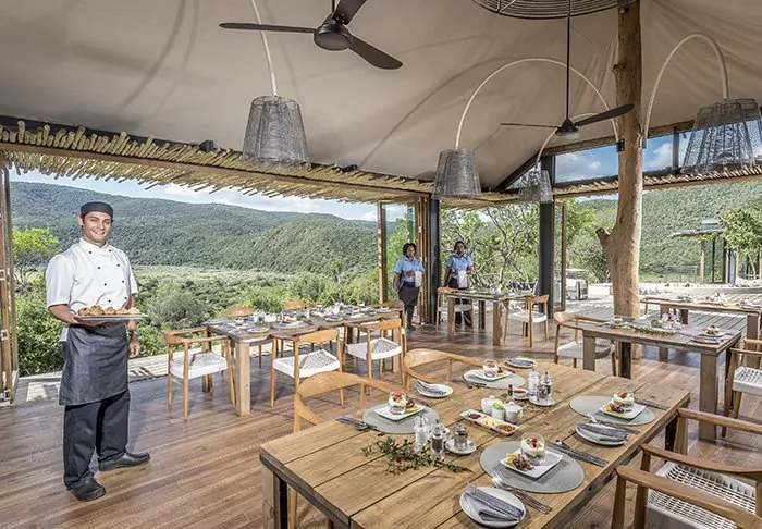 Utsikt är det genomgående temat för lodgen. Från rummen, från baren – ja, även från poolen har du den vackraste utsikten över dalen och floden Bushman’s River. Den enda platsen utan utsikt är vinkällaren…