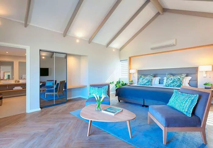 Hela hotellet är stilfullt inrett i diskreta nyanser som matchar den omkringliggande naturen och bidrar till den fridfulla och oasliknande miljön. Här finns 44 rymliga och moderna rum utrustade med te- och kaffefaciliteter i form av Nespresso-maskiner, aircondition, satellit-tv, värdeskåp, minikylskåp, hårtork, L’Occitane-toalettartiklar och USB-stickkontakter. Samtliga rum har en mysig privat terrass eller balkong med utsikt över havet och en av de två poolerna.