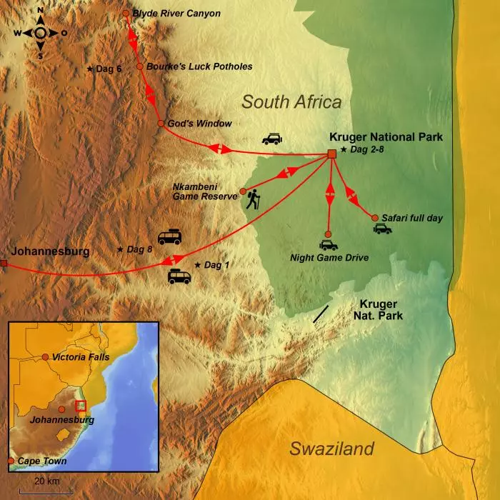 Du får chansen att komma riktigt nära The Big Five och lär dig att tolka naturens signaler under en spännande bushwalk med en kunnig parkvakt. Du upplever Sydafrikas högsta och längsta bergskedja, Drakensberg. Här bjuds du på spektakulära vyer över en av utflyktens höjdpunkter, Blyde River Canyon, som är världens tredje största kanjon. Du upplever också utsikterna från God’s Window och Bourke’s Luck Potholes, där floderna Blyde och Treur har gjort djupa, cylindriska formationer i bergen.