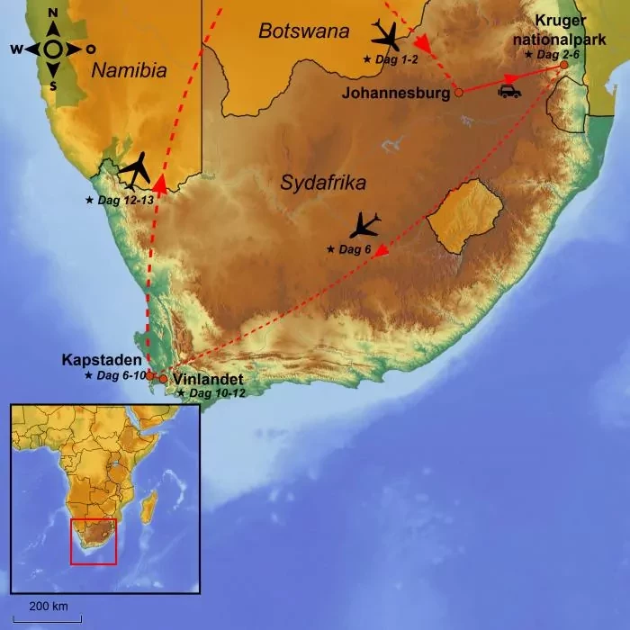 Vid ankomsten till Johannesburg blir du hämtad på flygplatsen och körd till Nkambeni Safari Camp ved Kruger nationalpark där du ska tillbringa de kommande fyra nätterna. Parken sträcker sig 350 km från söder till norr och ca 65 km från öster till väster och är därmed en av världens största nationalparker.