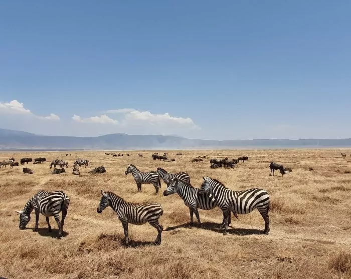 Sent på förmiddagen kommer du fram till Ngorongoro Conservation Area och kör upp mot kratern. Vegetationen ändrar sig nu markant jämfört med Serengetis plana slätter och nu dyker även massajerna upp – kvinnorna tvättar kläder i vattenhålen och de unga pojkarna driver boskap över gräsytorna.