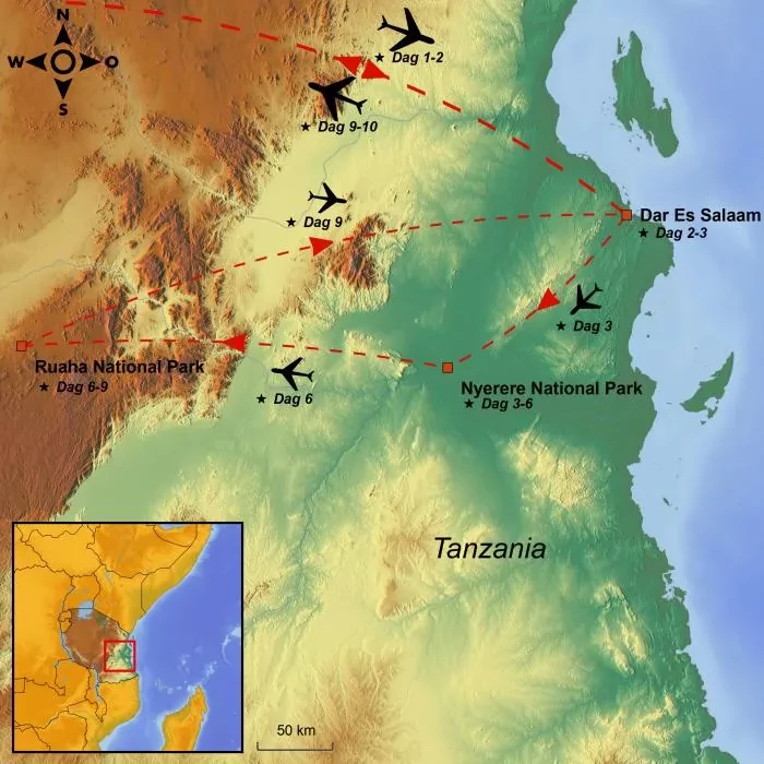 Idag reser du från din valda flygplats, och resan går till Tanzania i östra Afrika med mellanlandning(ar) på vägen.