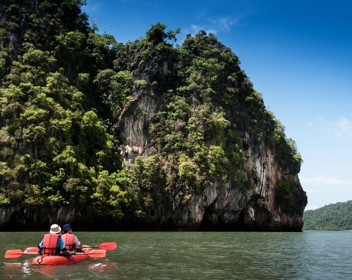 Du åker sedan vidare med en traditionell motorbåt och besöker öarna Koh Aung och Koh Talabeng med ikoniska kalkstensklippor och bildsköna bukter. På Koh Talabeng väntar en oförglömlig kajaktur runt ön, då du upplever dess orörda natur, storslagna kalkstensklippor och fascinerande grottor.