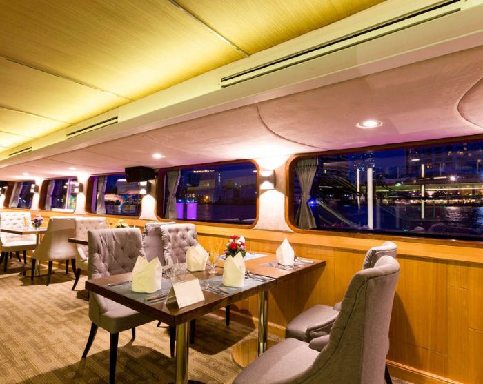 Följ med på en av de populära kvällskryssningarna på Chao Praya-floden som inkluderar välkomstdrink, middag och underhållning.