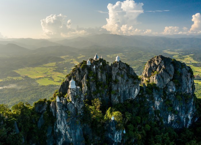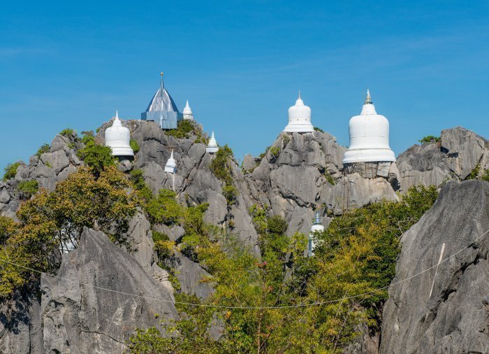 Du ankommer till en parkeringsplats, där en shuttlebuss kör dig den sista biten uppför berget. Sedan leder 500 steg dig till toppen av ett av Thailands mest imponerande utsiktspunkter. Det är jobbigt att ta sig upp till toppen, men när du väl står där belönas du med en obeskrivlig panoramautsikt över byarna, Thung Thung-dalen och inte minst templets vita pagoder, som vilar på de skyhöga bergstopparna – en fullkomligt fantastisk syn! Guiden berättar historien om det religiösa verket, som bara har några få år på nacken, och du får tid nog att njuta och beundra platsen och det imponerande arbetet.