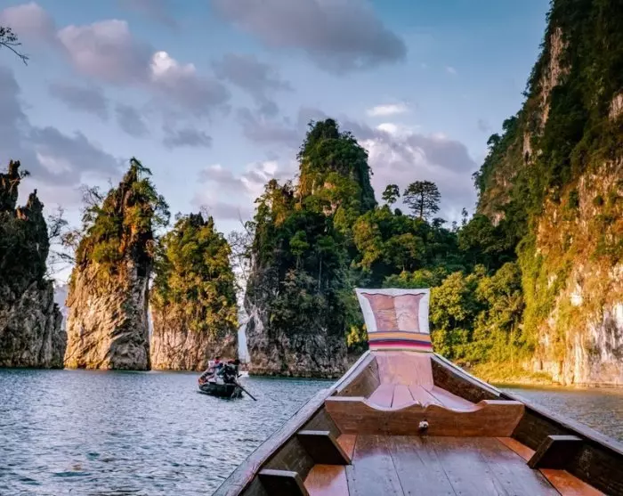 Sedan körs du till Ratchaprapa-piren, tätt inpå den imponerande dammen. Här kliver du ombord på en traditionell träbåt och seglar ut på Cheow Lan-sjön, där du kan njuta av det majestätiska landskapet med de ikoniska kalkstensklipporna.